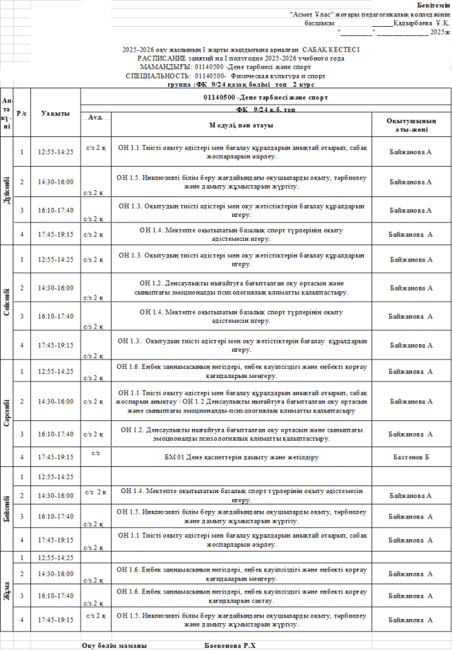 2024-2025 оқу жылының І жарты жылдығына арналған САБАҚ КЕСТЕСІ РАСПИСАНИЕ занятий на І полугодие 2024-2025 учебного года МАМАНДЫҒЫ/СПЕЦИАЛЬНОСТЬ : 01120100-Мектепке...