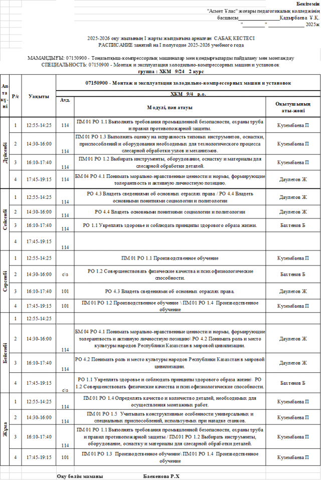 2024-2025 оқу жылының І жарты жылдығына арналған САБАҚ КЕСТЕСІ РАСПИСАНИЕ занятий на І полугодие 2024-2025 учебного года МАМАНДЫҒЫ/СПЕЦИАЛЬНОСТЬ : 01120100-Мектепке...