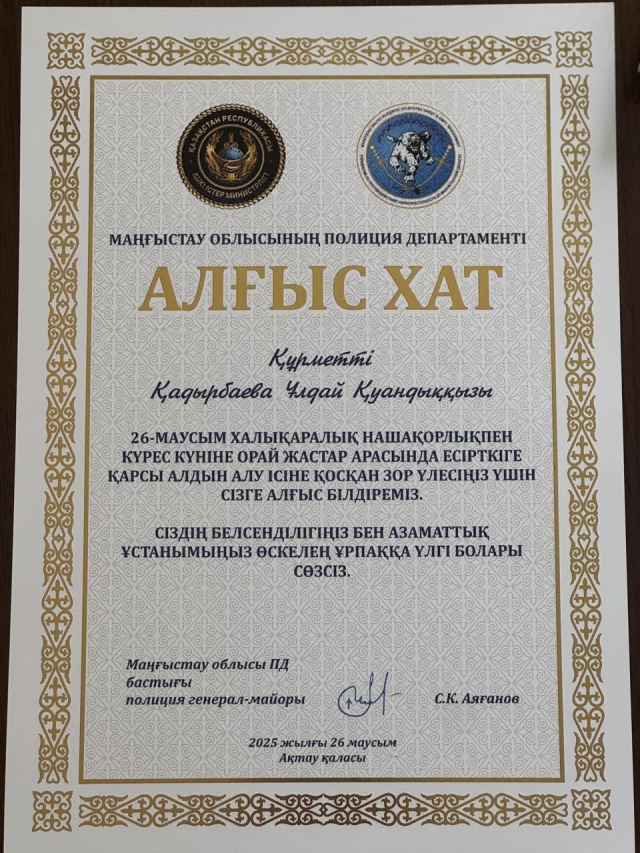 Маңғыстау облысының полиция департаменті, 26-маусым Халықаралық нашақорлықпен күрес күніне орай жастар арасында есірткіге қарсы алдын алу ісіне қосқан зор үлесі үшін, колледж басшысы Ұлдай Қуандық Қадырбаеваны және басшының тәрбие ісі жөніндегі орынбасары Фейзова Марина Павловнаны “Алғыс хатпен” марапаттады????????????