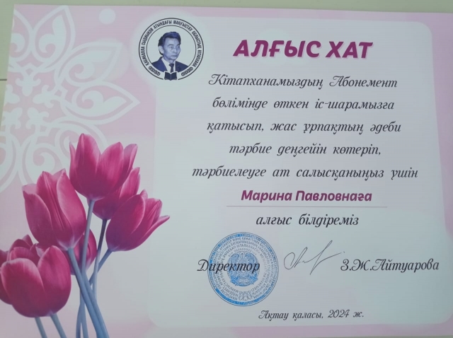 Қ. Сыдыиқов атындағы Маңғыстау облыстық кітапханасында Жас ұрпақтың әдеби тәрбие деңгейін көтеріп, тәрбиеге ат салысқаны үшін колледждің тәрбие ісі жөніндегі орынбасары Фейзова Марина Павловна алғыс хатпен марапатталды.