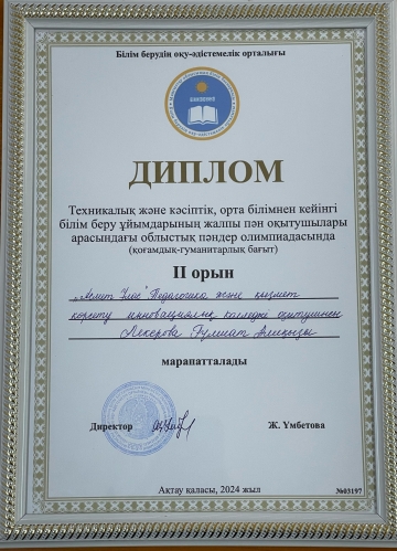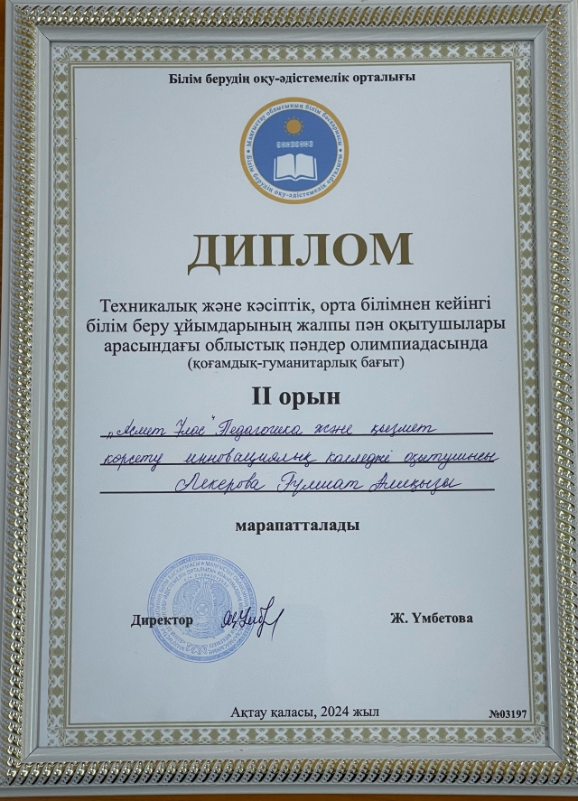 21-22 ақпан күндері Маңғыстау облысының білім басқармасы Білім берудің оқу-әдістемелік орталығы ұйымдастырған техникалық және кәсіптік,орта білімнен кейінгі білім беру ұйымдарының жалпы пән оқытушылары арасындағы облыстық пәндер олимпиадасы өткізілді.Онда қоғамдық-гуманитарлық бағыты бойынша екі кезеңнен де сүрінбей, өз білімін жоғары дәрежеде көрсетіп жүлделі II орынға ие болған колледжміздің қазақ тілі және әдебиет пән оқытушысы Г.А. Лекерова марапатталды.Құттықтаймыз!!!