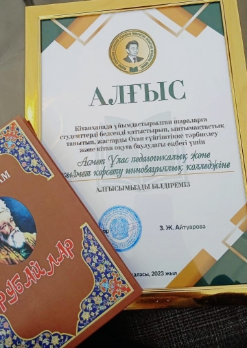 Отан сүйгіштікке тәрбиелеу және кітап оқуға баулудағы еңбегі үшін колледжіміз алғыс хатпен марапатталды
