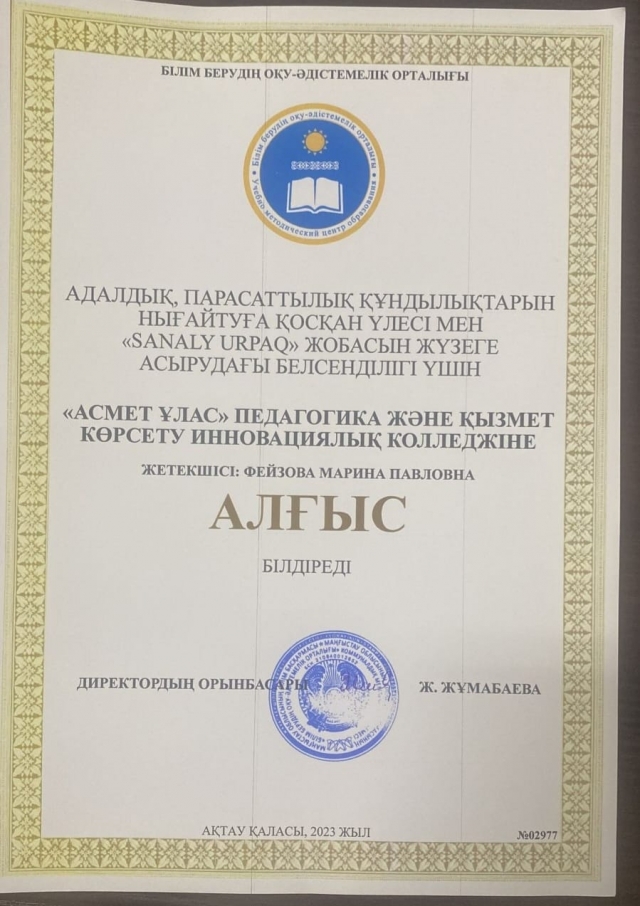 20.12.2023 ж Sanaly urpag” студенттік клубтарының облыстық слеті өтті. Слет барысында студенттердің бойына адалдық , парасаттылық құндылықтарын сіңіруге қосқан үлесі мен “Sanaly urpag” жобасын жүзеге асырудағы белсенділігі үшін Білім берудің оқу- әдістемелік орталығы Алғыс хат табыстады.