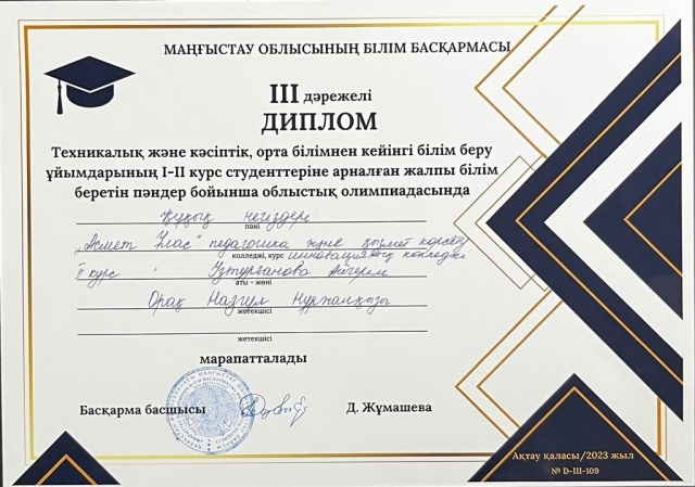 - Абдулла Әлия (1 курс НО-9/23,2 тобы) Қазақстан тарихы пәні бойынша III орын. Жетекшісі: Башарова П.М.