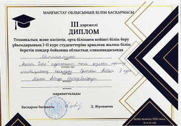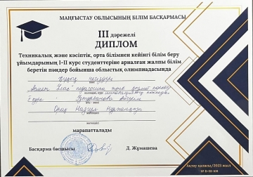 - Әбсаматова Айгерім (1 курс ТПП-9/23 тобы) орыс тілі мен әдебиеті пәні бойынша III орын. Жетекшісі: Караубаева А.З.
