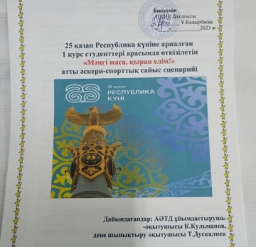 25 қазан Республика күніне арналган 1 курс студенттері арасында өткізілген "Мәңгілік жаса,қыран елім"атты әскери - спорттық сайысы.Ұйымдастырушы АӘД пәнінің оқытушысы Кульманов К.Е және дене тәрбиесі оқытушысы Дуйскалиев Т.Ш