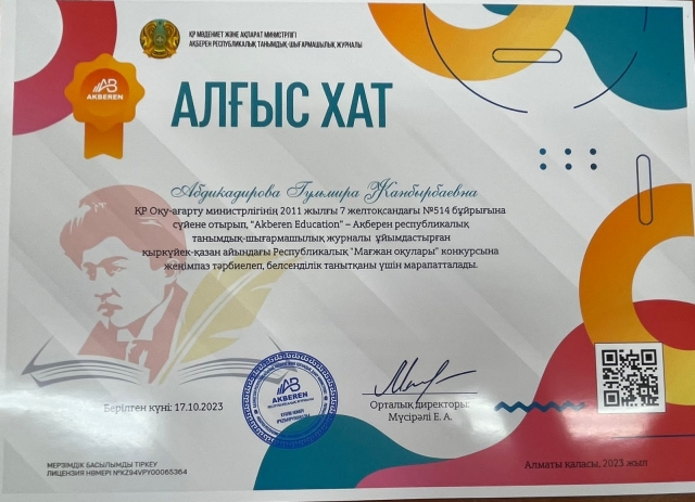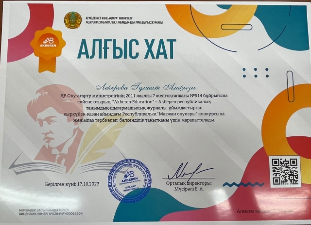 “Мағжан оқулары” байқауына жеңімпаз дайындап, белсенділік танытқан қазақ тілі мен әдебиеті пәні оқытушылары Абдикадирова Г.А, Лекерова Г.А. алғыс білдіреміз! Шығармашылық табыс тілейміз!
